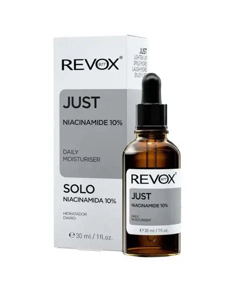 Revox B77 JUST Niacinamide 10% is a balancing serum that helps regulate excess sebum, minimize the appearance of pores, and improve overall skin texture. Formulated with 10% pure niacinamide (Vitamin B3), it works to even out skin tone and reduce blemishes while strengthening the skin barrier.