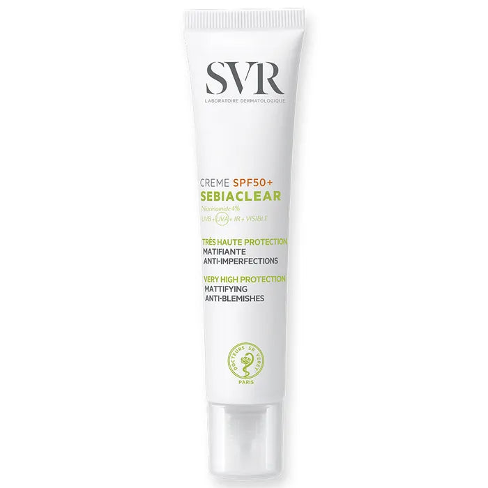 Protect and care for acne-prone skin with SVR Sebiaclear Crème SPF50, a high-protection sunscreen specifically designed for oily and blemish-prone skin. Enriched with mattifying agents and niacinamide, it shields against UVA/UVB rays while helping to reduce imperfections and prevent post-acne marks.