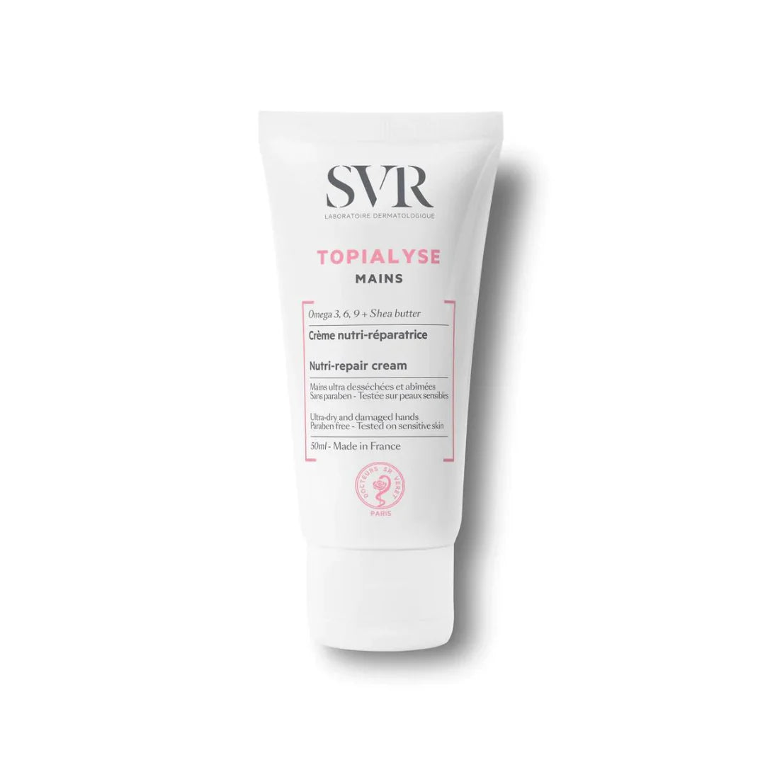 Rescue and protect severely dry, chapped, and damaged hands with SVR TOPIALYSE MAINS (HAND CREAM) 50ML. This intensive repair cream is expertly formulated to nourish, restore, and shield overworked hands from external aggressors and harsh conditions. Enriched with a high concentration of moisturizing and repairing active ingredients, it deeply hydrates, soothes irritation, and replenishes the skin's barrier. The non-greasy, non-sticky texture absorbs quickly, providing immediate comfort and leaving hands feeling soft, supple, and protected. Perfect for daily use, it helps to prevent further dryness and maintain healthy, comfortable hands, even for the most sensitive skin.
