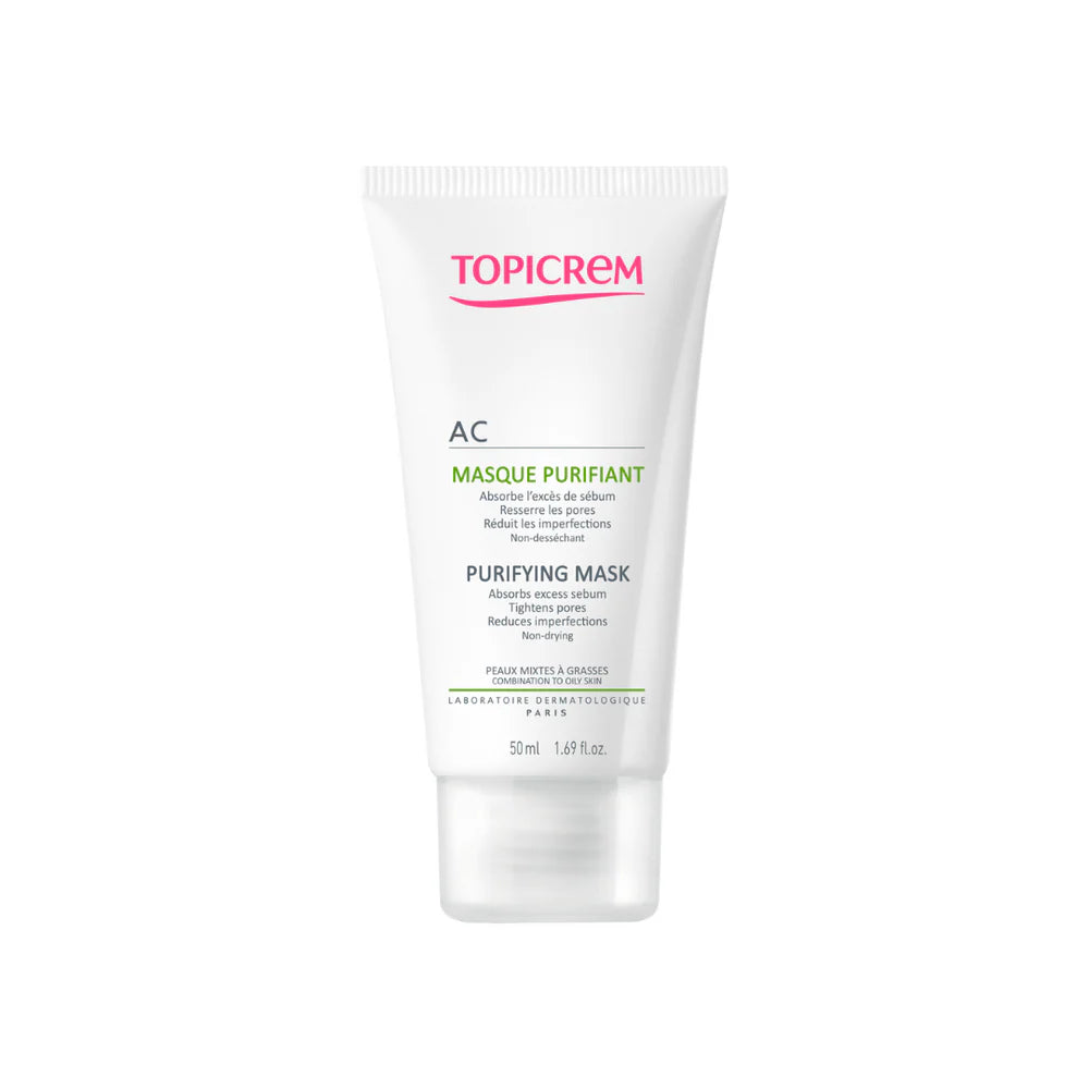 Topicrem AC Purifying Mask is a dual-action clay mask formulated to deeply purify, mattify, and soothe oily and acne-prone skin. Its gentle yet effective formula combines white clay (kaolin) and zinc to absorb excess sebum, unclog pores, and remove impurities without drying the skin. Enriched with glycerin for hydration, it leaves the complexion fresh, balanced, and visibly smoother after each use.